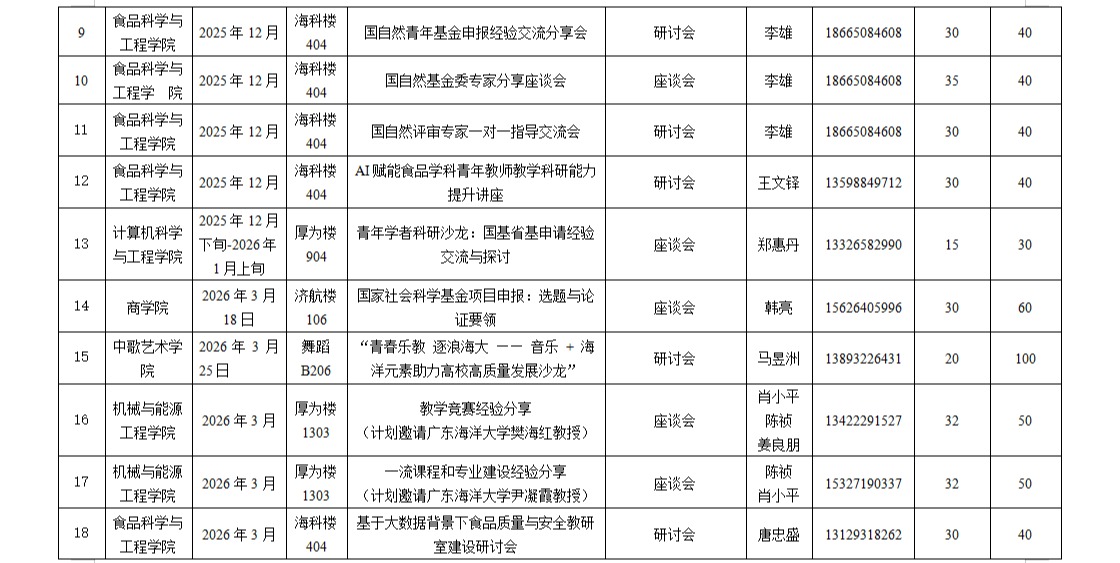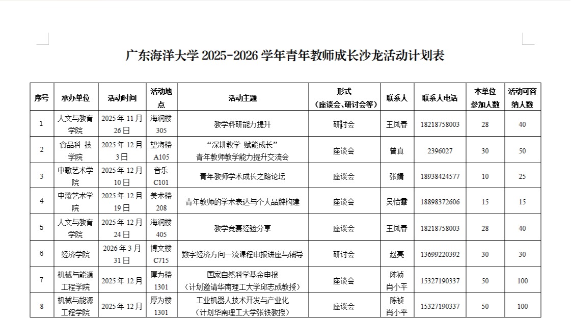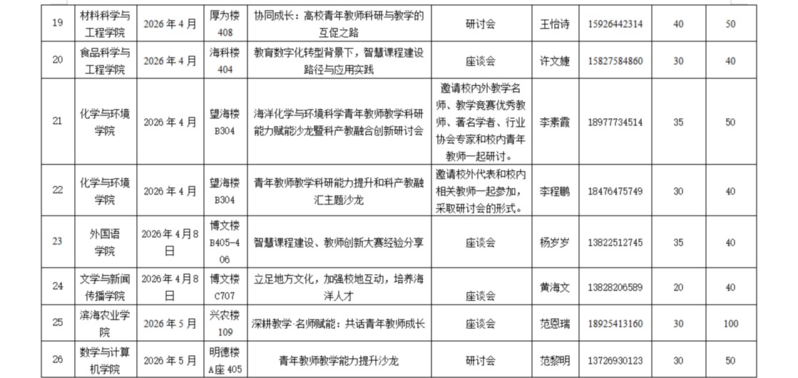 为进一步提升我校青年教师的师德修养与专业水平,促进青年教师快速成长,努力营造互相学习、共同进步的良好氛围,教师发展中心联合各学院将组织开展青年教师成长沙龙活动,探讨教师成长与教学质量提高等问题,开展学科间生动活泼的交流与合作,欢迎各位教师踊跃参加。2025-2026学年青年教师成长沙龙活动计划表如下: